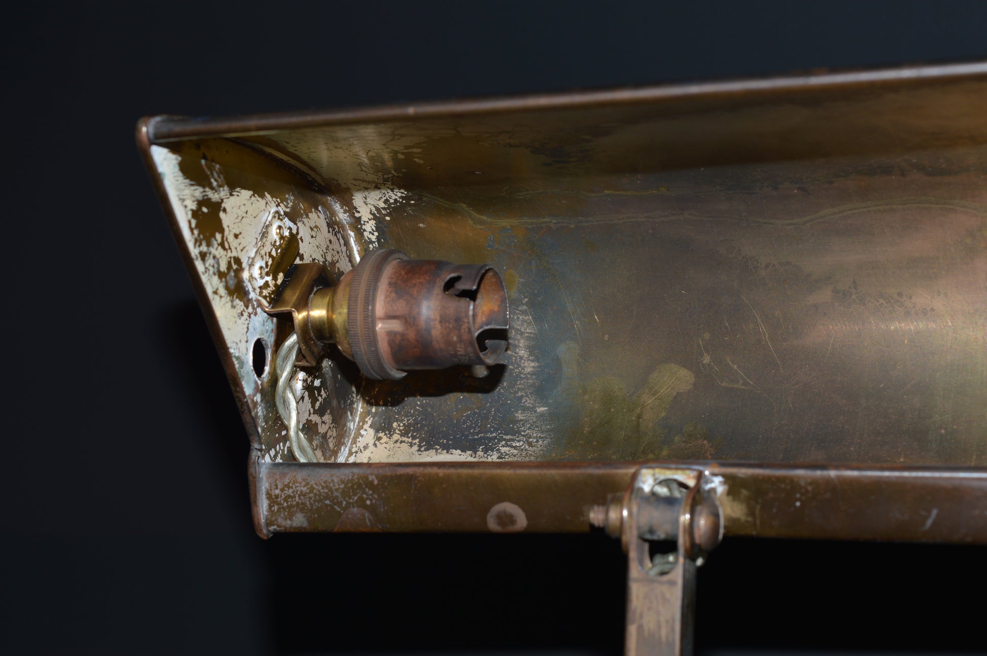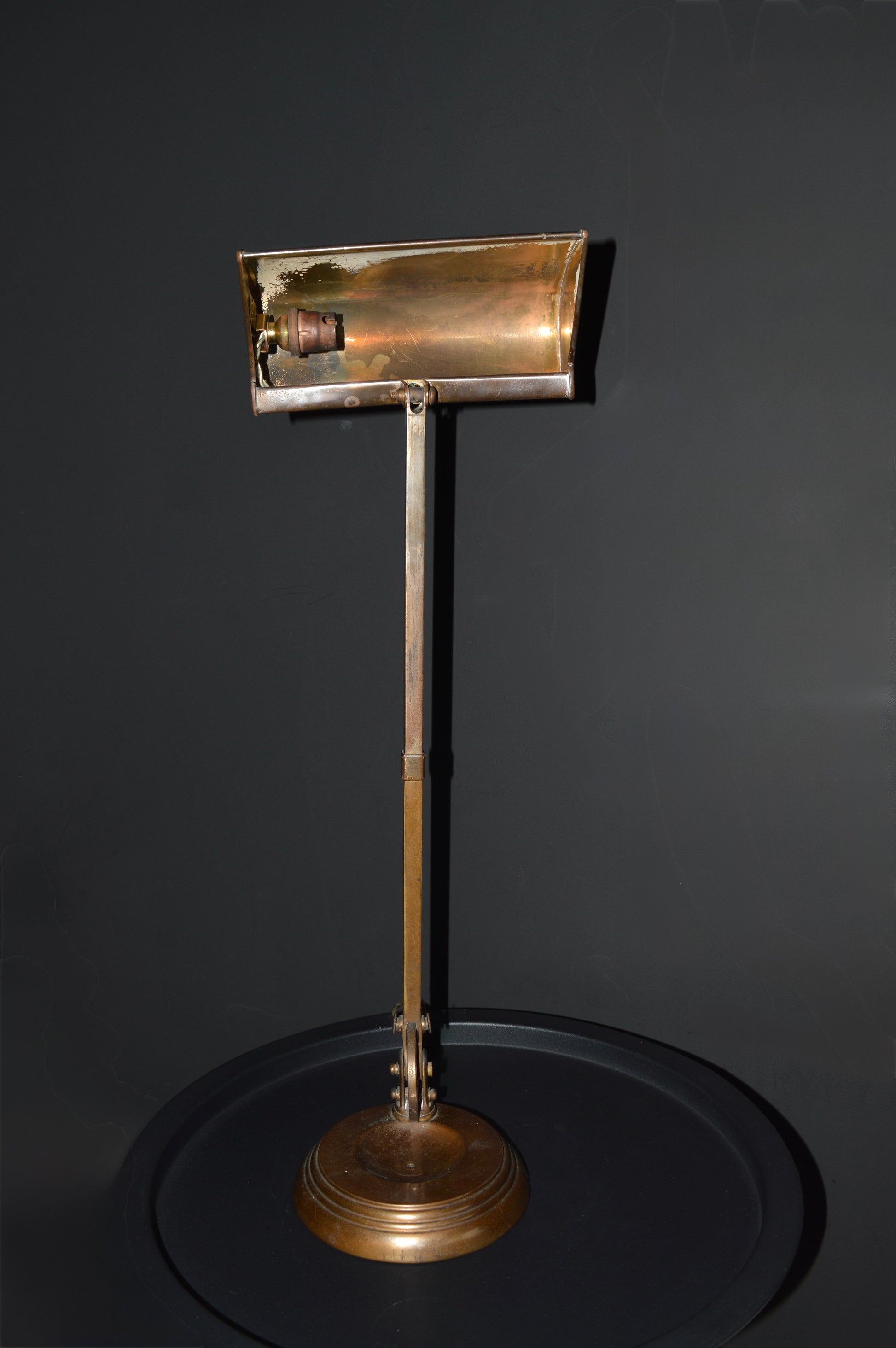 The heavy base supporting an adjustable arm and large shade. Some remaining original paint to the interior of the shade. Circa 1920's