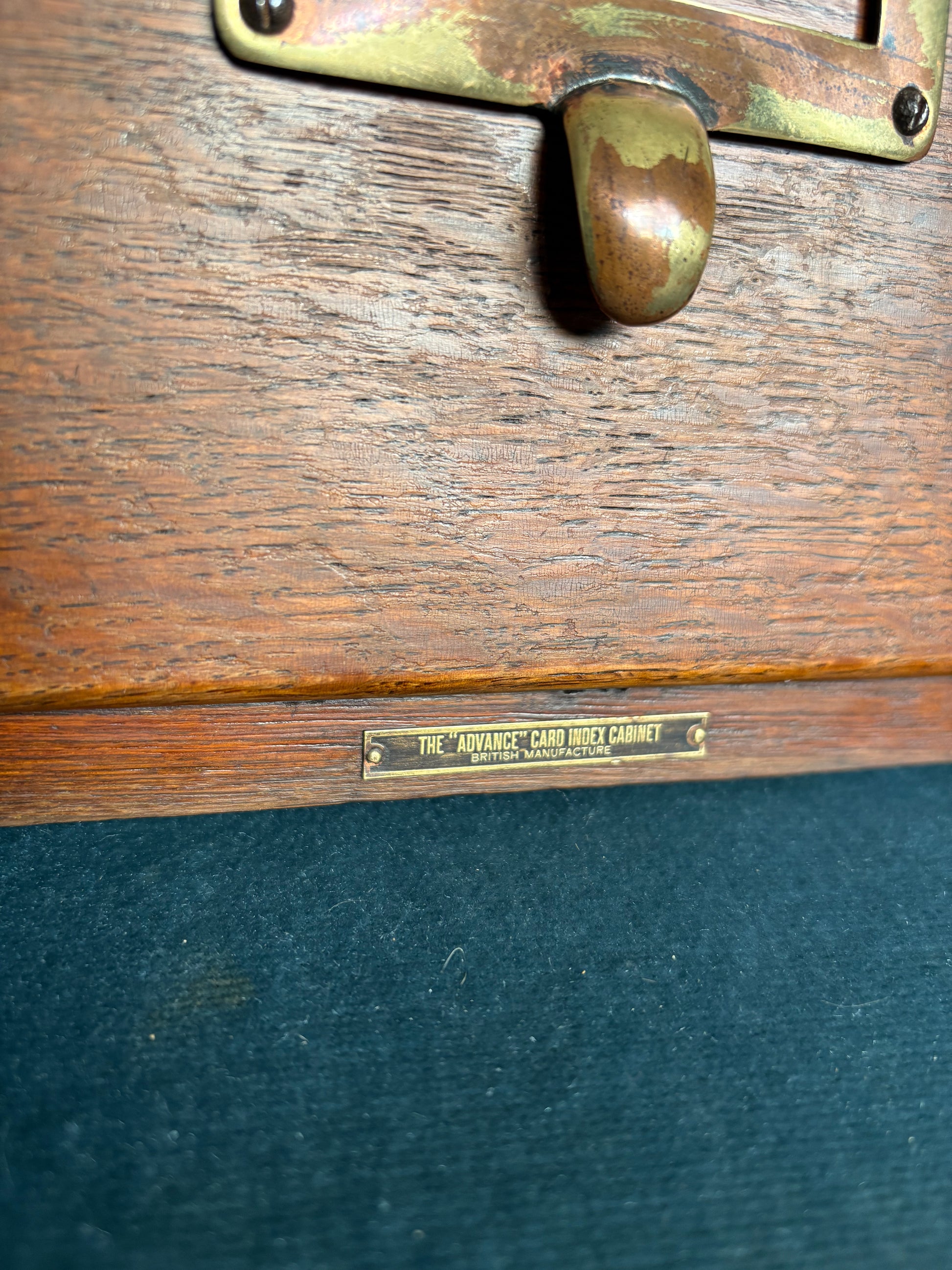 Perfect for organising documents, cards, or small valuables. Made from durable oak, wear as expected with age. Brass handle to the front. The drawer slides very smoothly.