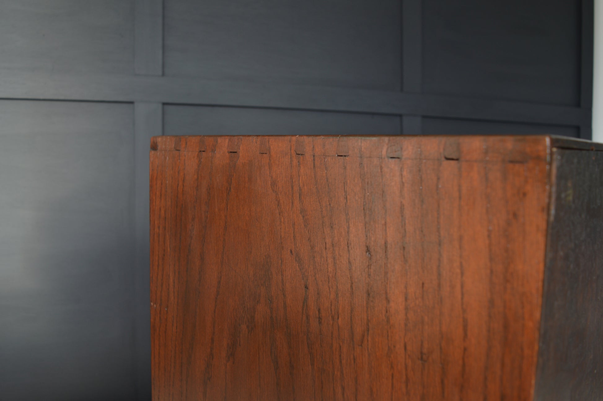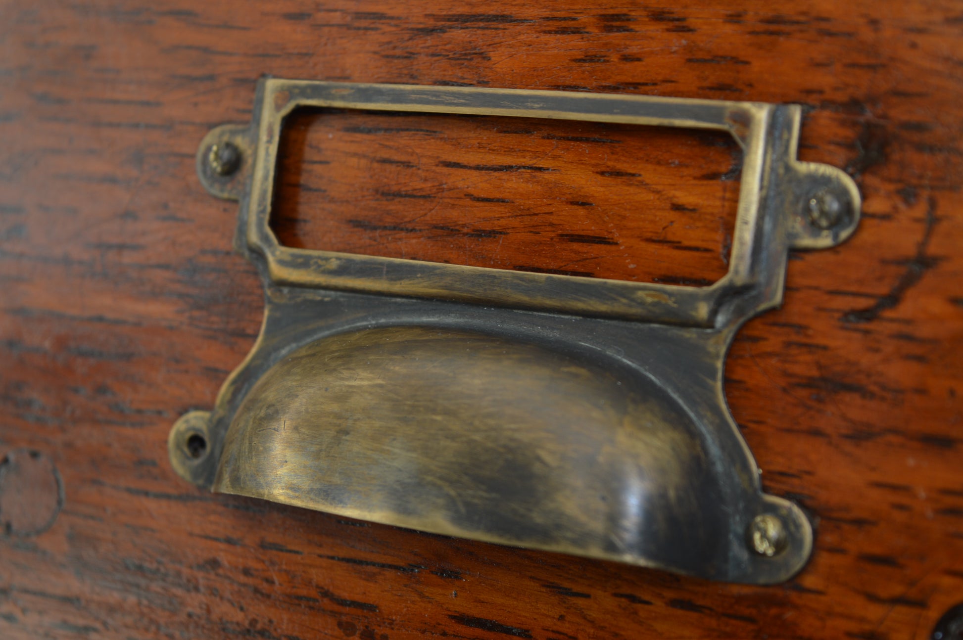 6 symmetrical drawers, each with their original solid brass handles & card plates. Wear commensurate with age. Dovetail joint construction. Complete with adjustable drawer sizers.