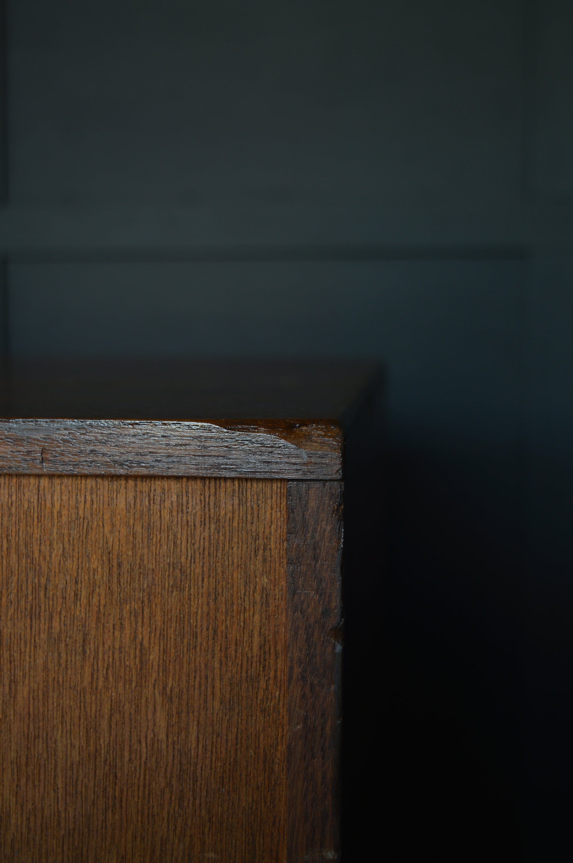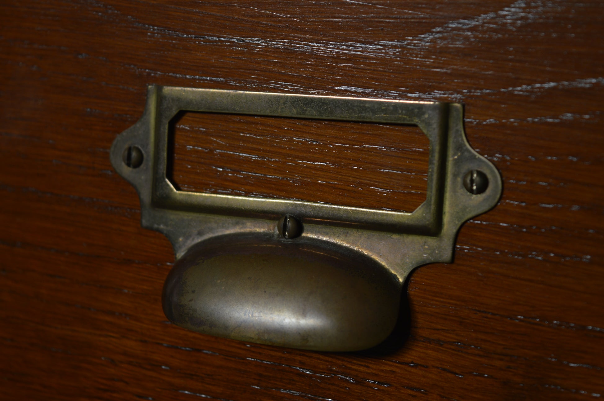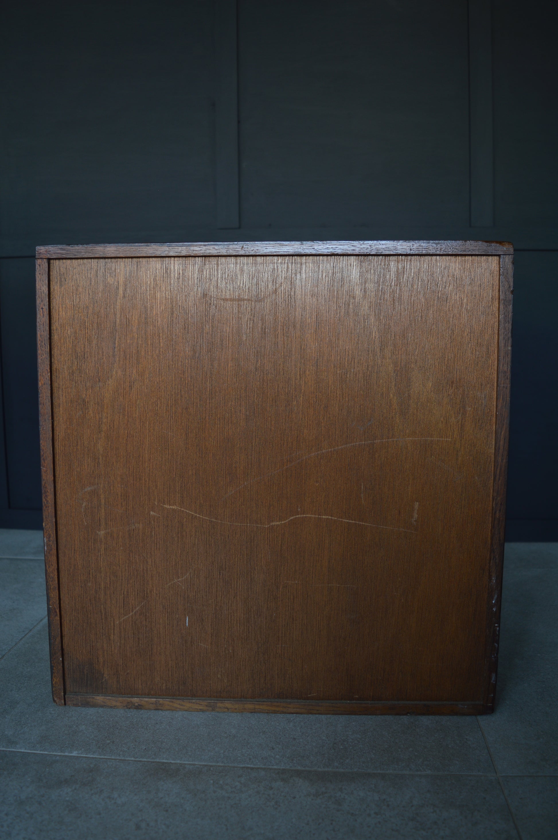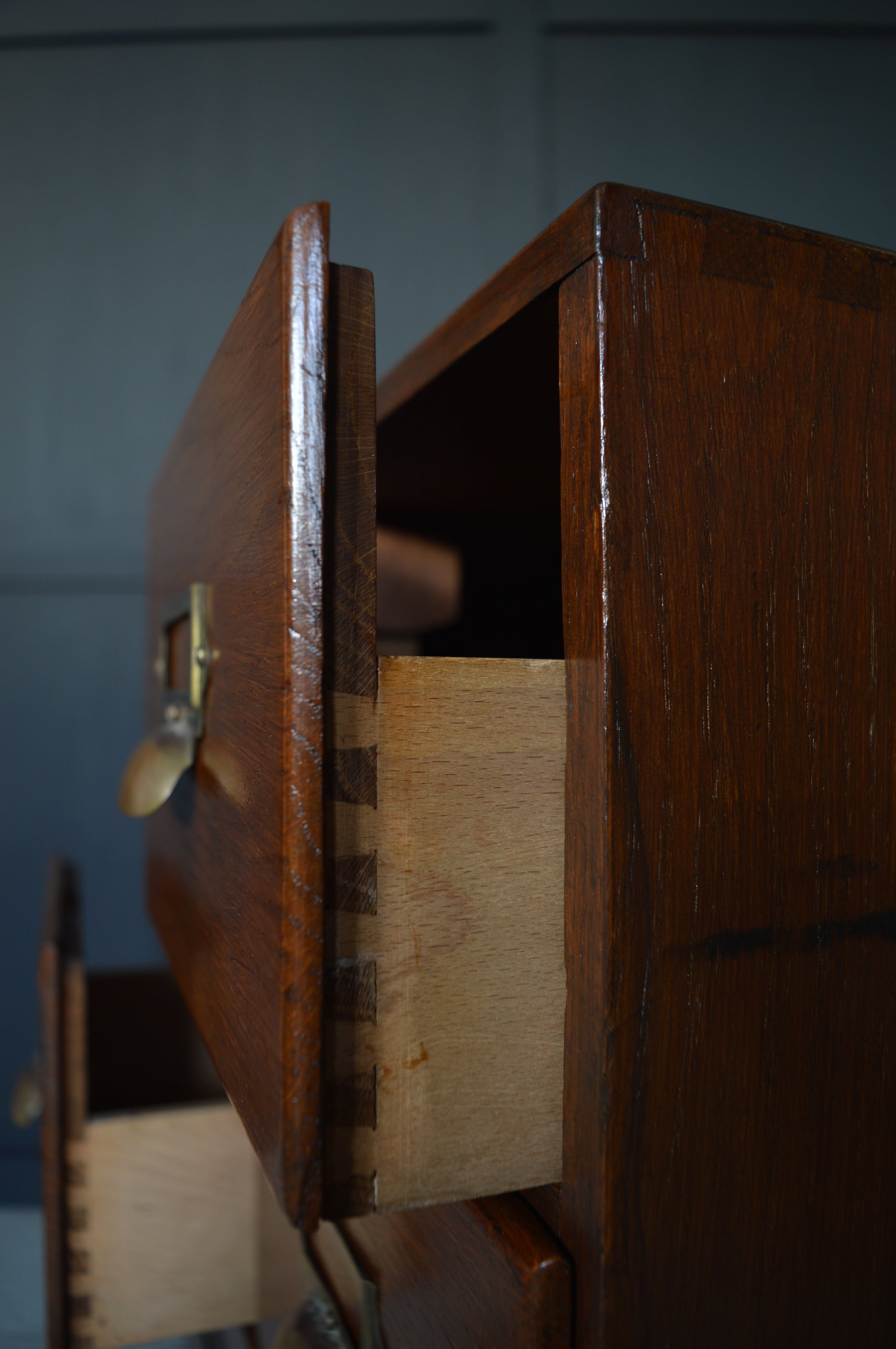 6 symmetrical drawers, each with their original solid brass handles & card plates. Wear commensurate with age. Dovetail joint construction. Complete with adjustable drawer sizers.