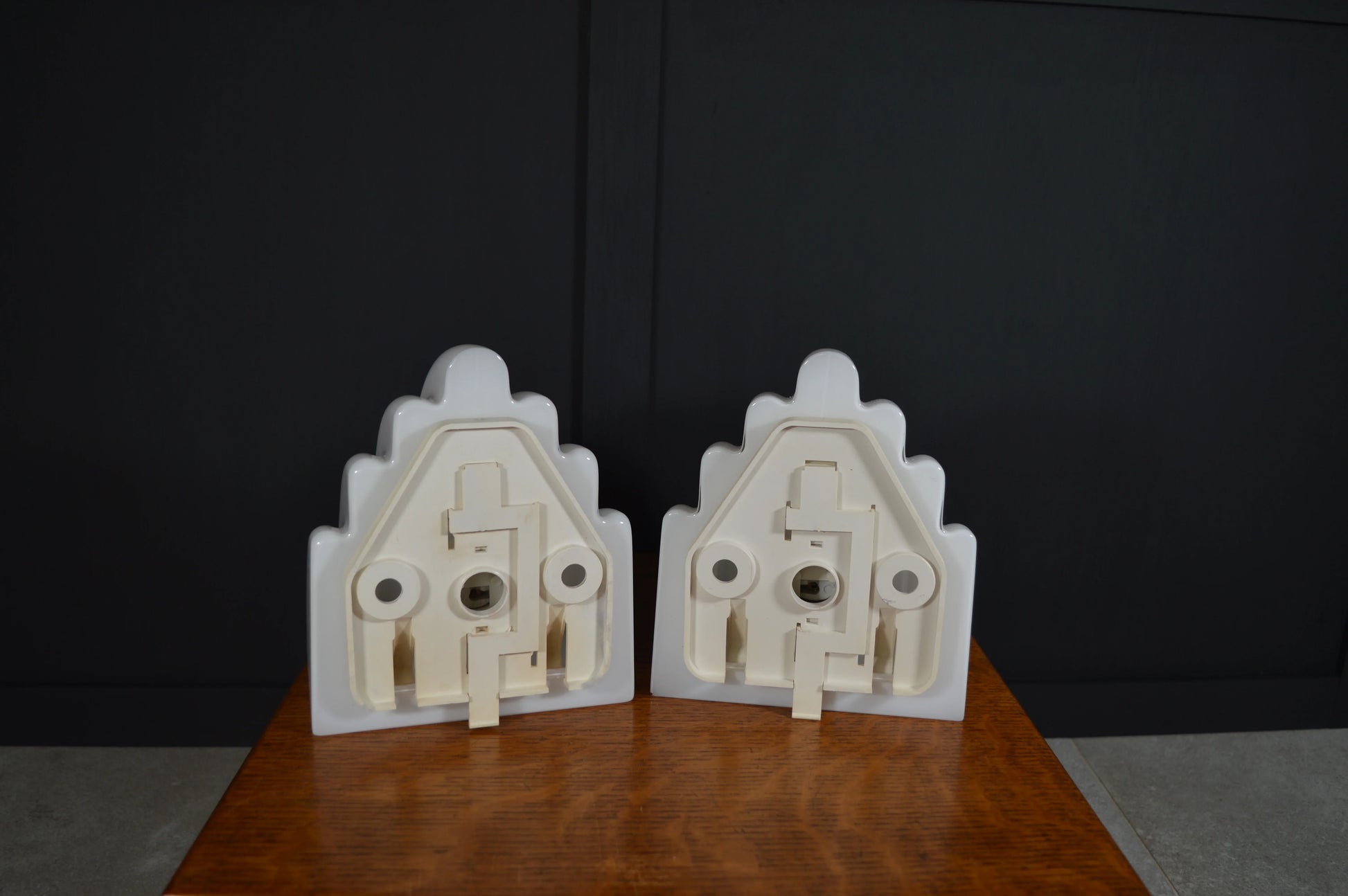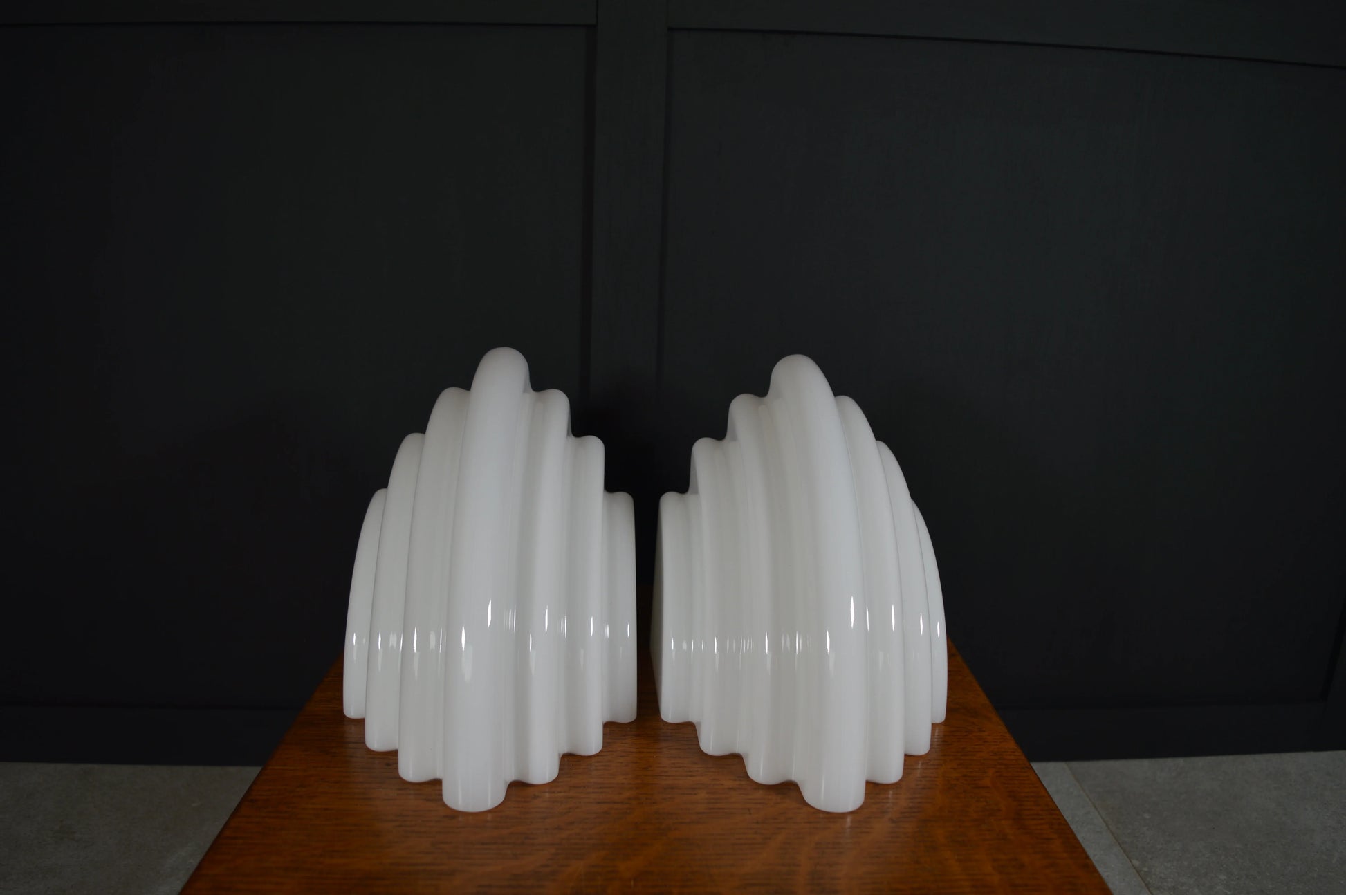 A pair of Art Deco revival Kai Wall Lamps by Kazuhide Takahama for Sirra. Circa 1970s, each having stepped moulded opaline shades, 18cm x 17cm x 15.5cm. Made in Italy.
