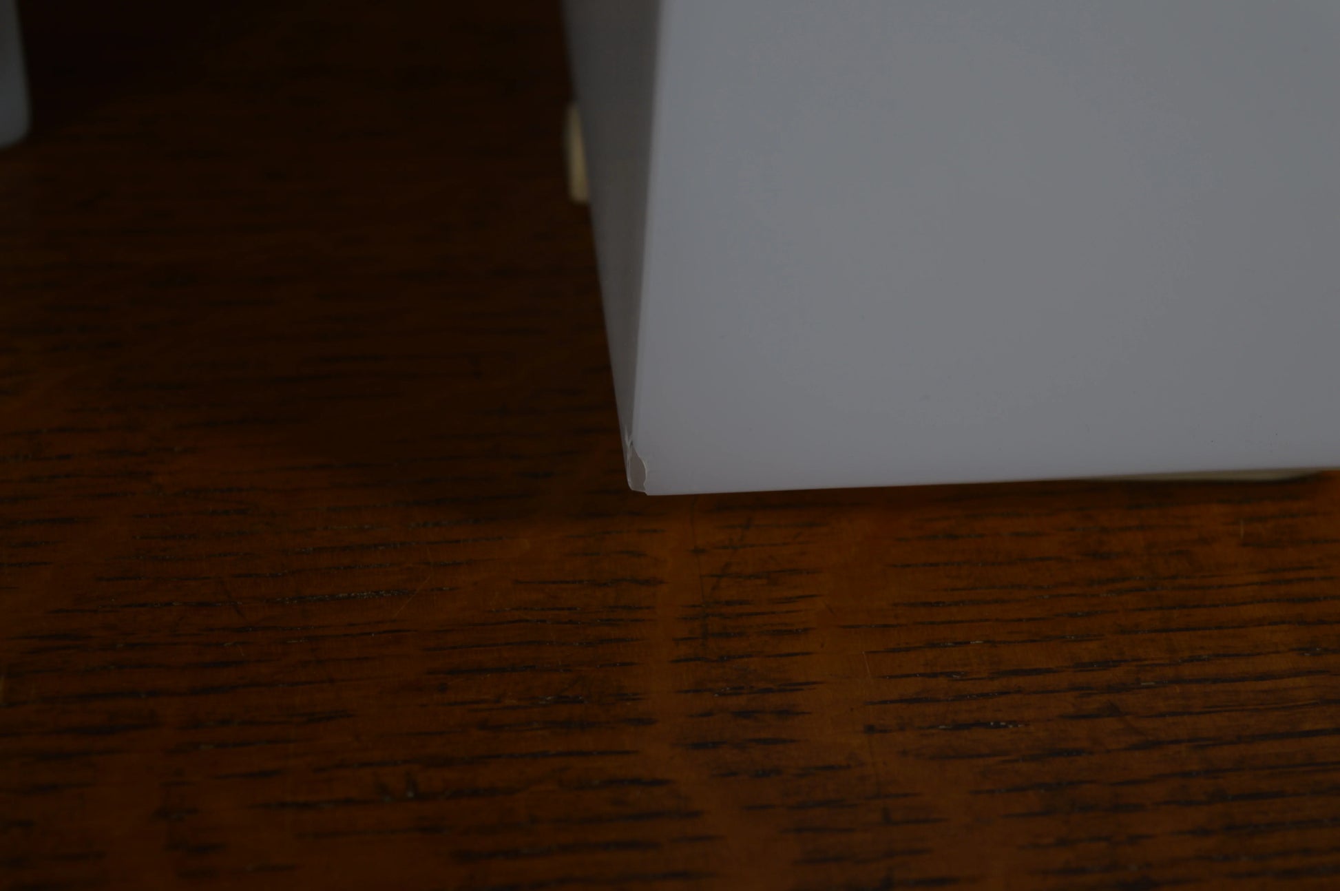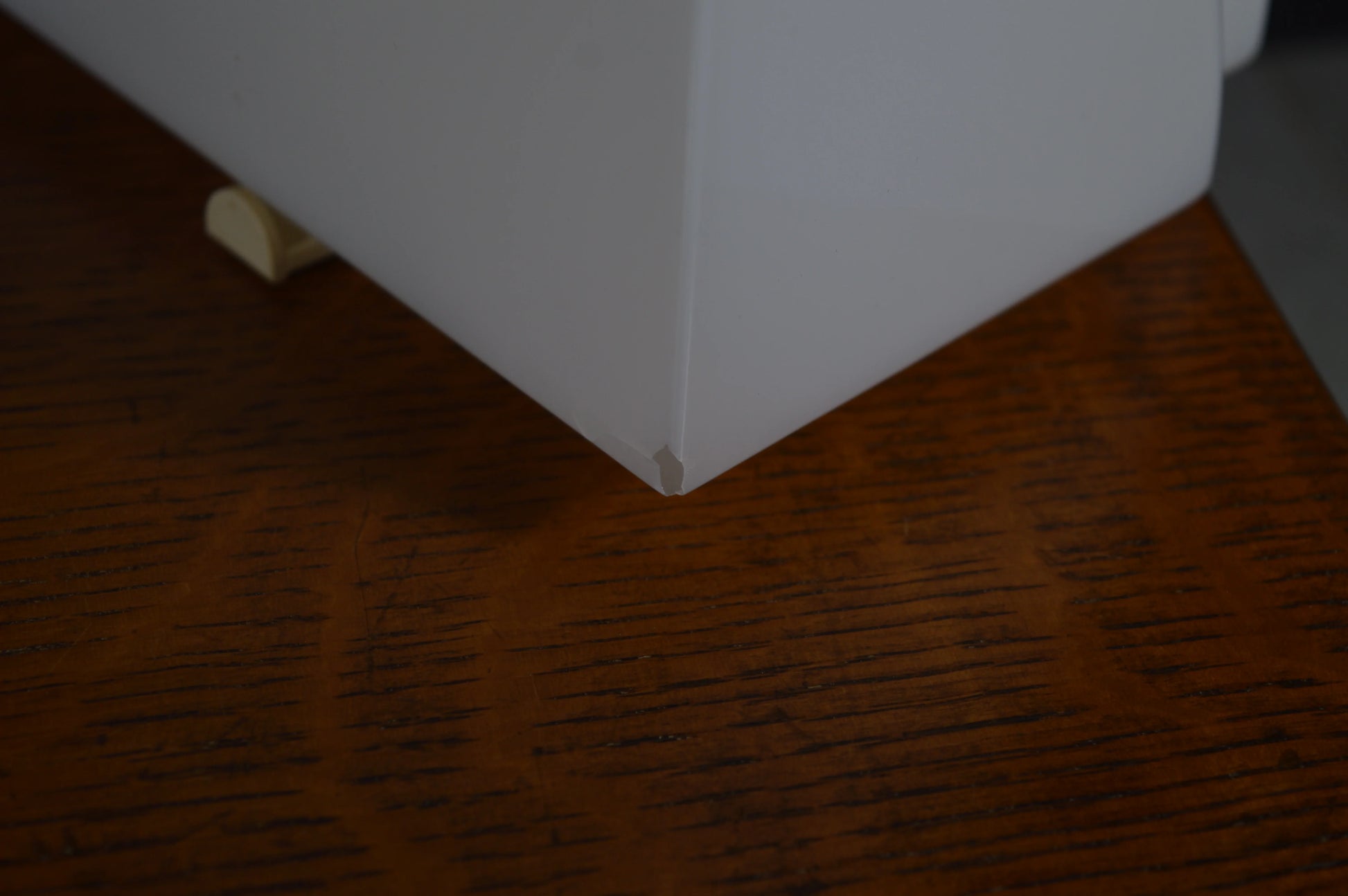 Tiny chip to one corner, see last 3 pictures. Not noticeable when mounted.