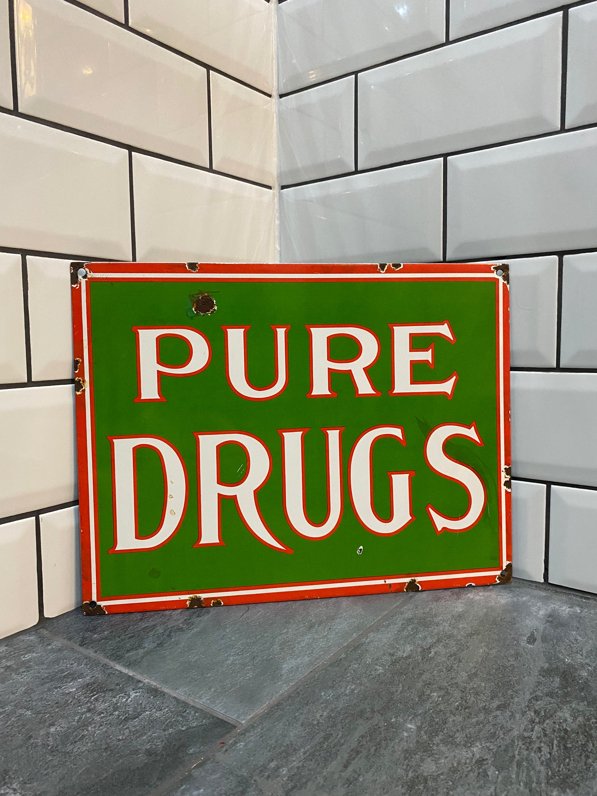 Add a touch of fun to your space with this Pure Drugs Enamel Sign. This bright sign is a must-have for any collector or interior design enthusiast. Its bold lettering and striking colours are sure to grab attention and elevate any room. (Perfect for adding a little personality to your home!)