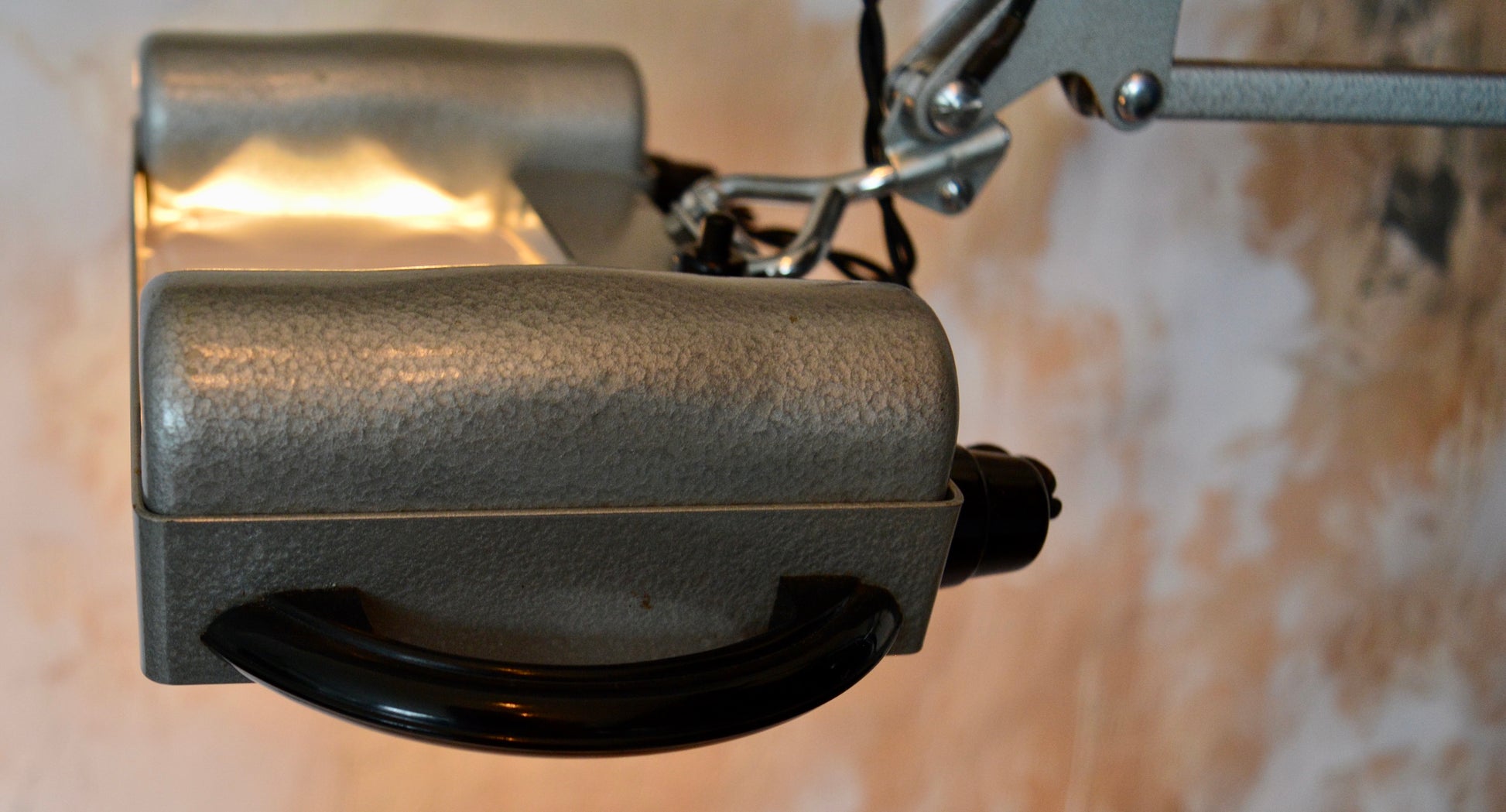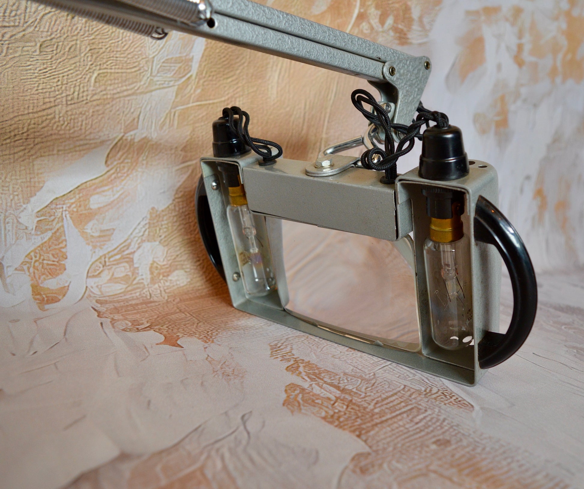Original paintwork & magnifying shade with dual light bulbs & Bakelite handles. An extremely robust & handsome lamp, wired in twisted black flex via the original Bakelite bulb holders.