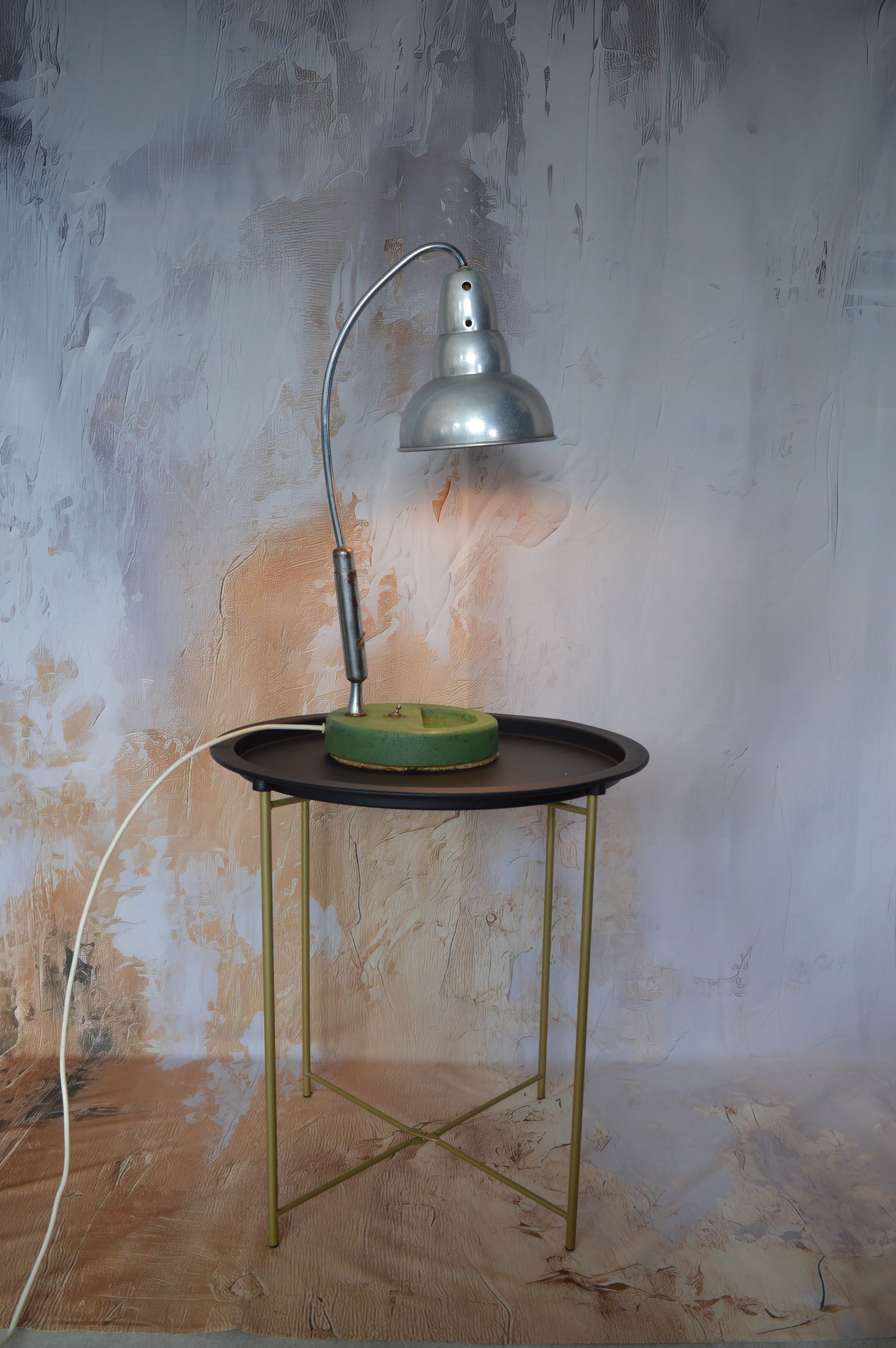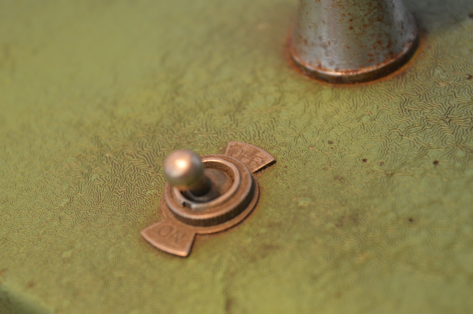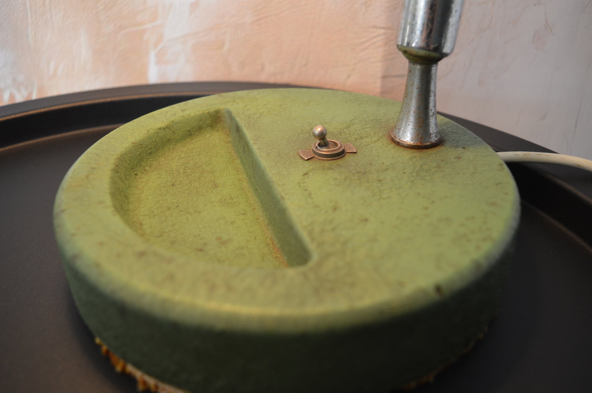 Green Japanned cast iron base with switch, multiple position adjustments possible to shade and column.