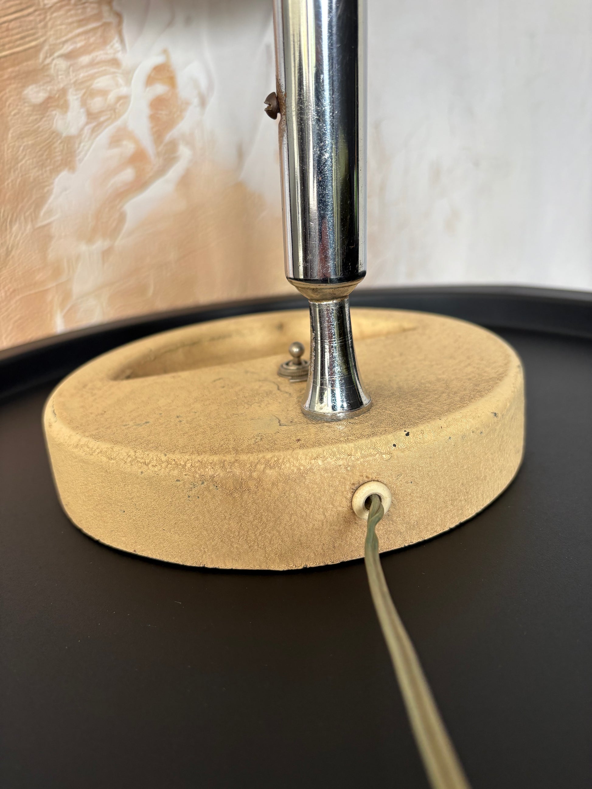 Cream Japanned cast iron base with switch, multiple position adjustments possible to shade and column.